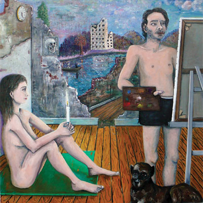 The work by Eric Corne causes an immediate strangeness and curiosity, while showing a pacifying familiarity. Studio, artist, muse, canvas, brushes, everything appears to be positioned so that his world can happen, can occur. This world of his is built up between the private and the public, between the secret and its immediate revelation, diluting boundaries and bouncing off walls assuming the interstitium between inside and outside. The studio is now the world where the tragic, the mundane, the melancholic and beautiful cohabit in a kind of impossible relationship, shaped by history, literature, painting, theater or myth. The architectural structure formerly opaque, "closed", material, now becomes translucent and "open", receptive to the gaze of the other. The place is thought by the gesture of the artist laying invisible bridges articulated with concepts permeable and provisional. Corne elects the world as privileged stage for the creation and support of contemporary artistic discourses, linked to the idea of “to form” territory with others and are committed to a complex and participatory reality.