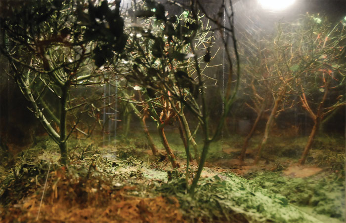 Poplar plywood, acrylic glass, mirror film, branches, leaves, moss and acrylic paint.